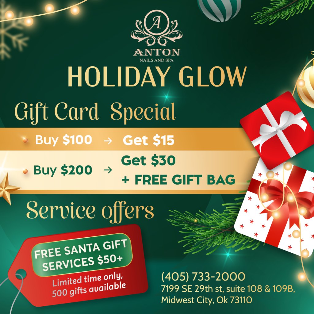 Anton Nails And Spa is committed to hygienic excellence and customer comfort, using disposable liners, brand-new files and buffers for every guest, and individually sterilized tools for each appointment. Complimentary drinks are available, and gift certificates make perfect presents for any occasion.